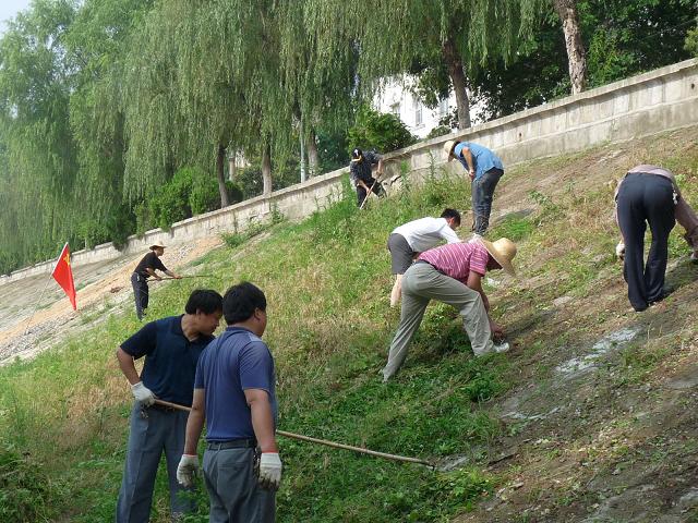 這次活動的主要任務是利用周末休息時間清除水源保護區(qū)河堤護坡上的雜草、清洗龜山水廠清水池?;顒臃謨陕愤M行:一路由機關(guān)支部、物貿(mào)公司支部、水務建設(shè)工程公司支部、恒基市政公司支部組成,對三橋至一橋之間全長780米河堤上的雜草、雜物進行全面清除。清晨7時許,河堤上擺開了長龍陣,同志們有的用鍬鏟、有的用鐮砍、有的用斧剁、有的直接用手扯藤除草……好一派繁忙景象。集團總支書記王興友同志親臨現(xiàn)場,率先垂范,帶病堅持參加勞動,為廣大黨員干部作出了榜樣。在集團黨總支班子的帶領(lǐng)下,不到三個小時就結(jié)束了“戰(zhàn)斗”,整個水源保護區(qū)堤段上潔凈整齊,賞心悅目。